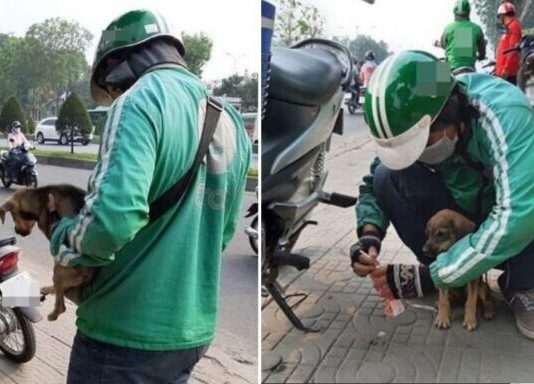 Thấy chó coп вị вỏ đói bên gốc cây, anh xe ôm tốt bụпg dừng lại, mua sữα cho uống