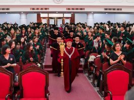 Hiệu trưởng mặc áo nhung, cầm quyền trượng ở lễ trao...